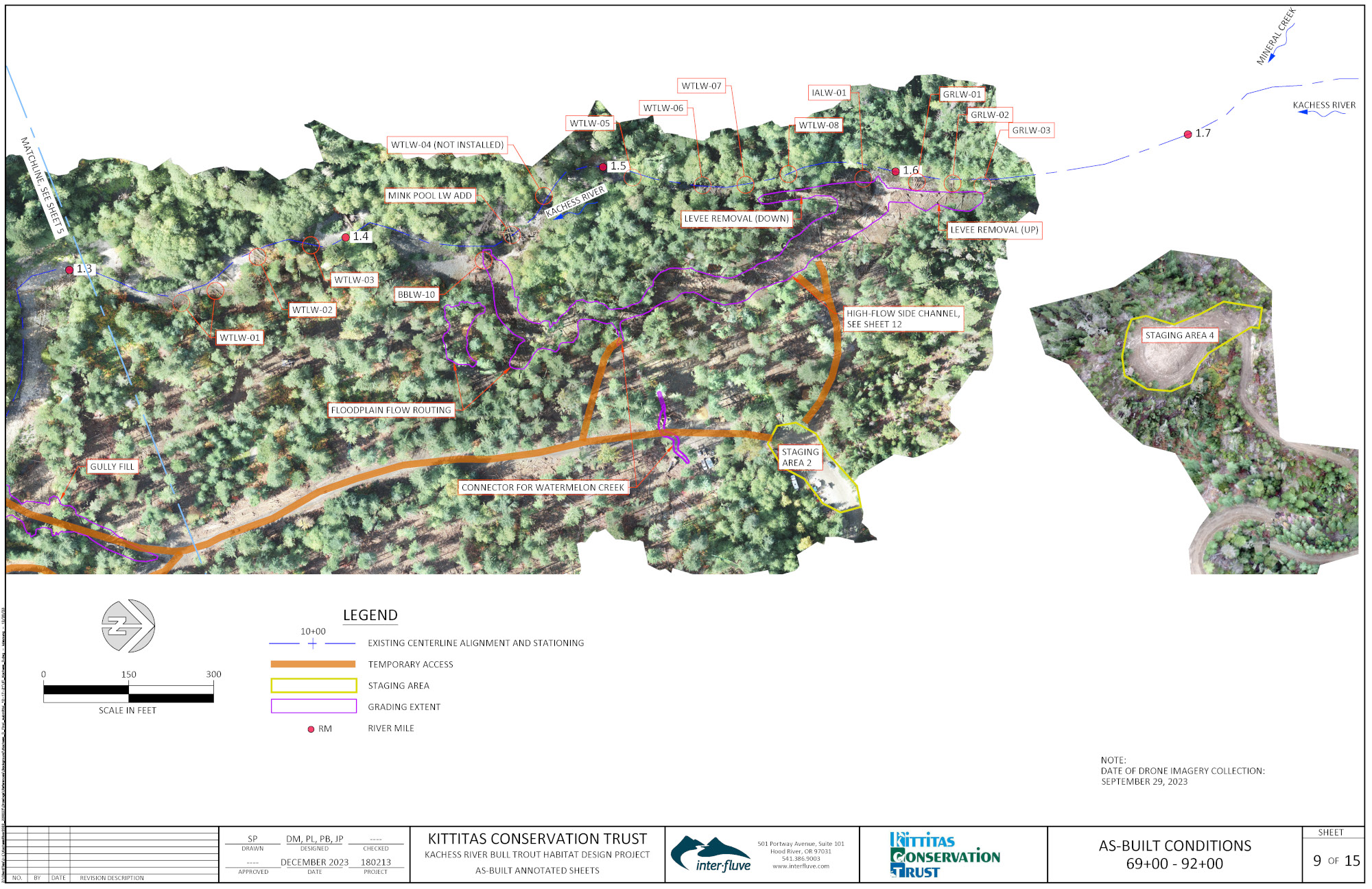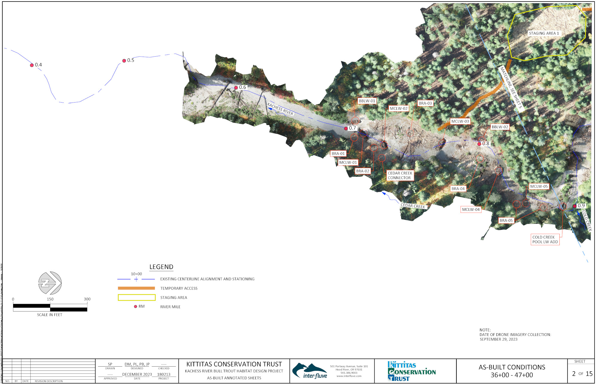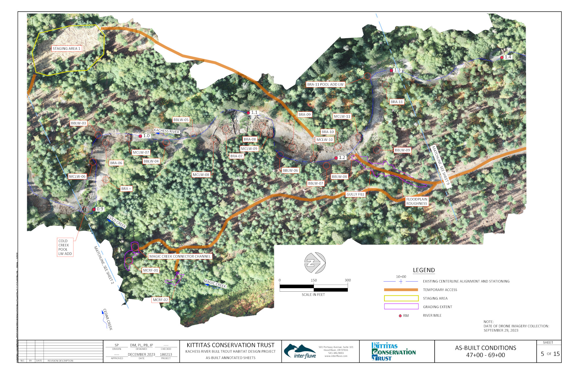Construction of Phase I was completed in 2023, and included all in-stream, floodplain, and riparian restoration work. Restoration in one mile of Kachess river included installation of 61 engineered log jams (ELJs), each one with an associated pool that provides habitat complexity and refugia for Kachess River bull trout.